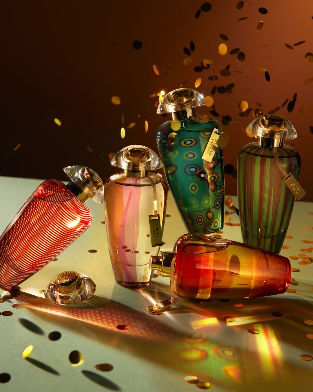 The sophisticated creations are boxed in precious perfume bottles inspired by the millenary art of Venetian glass.